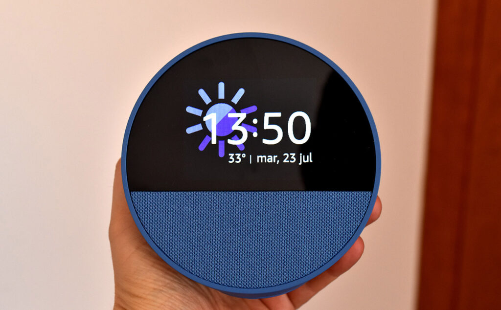La pantalla del Echo Spot está orientada hacia arriba, lo que facilita que podamos verla fácilmente desde cierta altura sin tener que agacharnos. Cuenta con un conector de alimentación propietario (¿por qué Amazon no utiliza un conector USB Tipo-C?), pero carece de conector de 3.5mm para enviar la salida de sonido a un altavoz externo o auriculares.